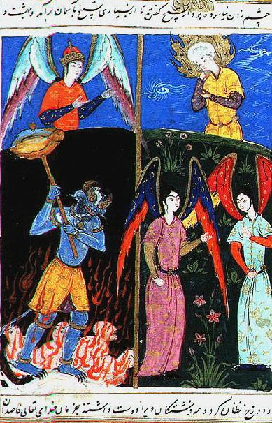 Se le ordena entonces al Ángel de la Muerte que tome el alma de Idris, pero solo durante un instante, tras el cual le será devuelta. Al momento el ángel retira la vida de Idris, y entonces, éste le pide que le muestre el Infierno en primer lugar. El ángel le dirige el descenso entre profundas dunas y cuevas hasta dar con Malik, su cuidador, quien lo agarra dispuesto a arrojarlo al abismo cuando una voz del cielo exclama, «¡Malik, tened cuidado! No hagáis daño a mi profeta Idris, pero enseñadle los terrores de vuestro reino».