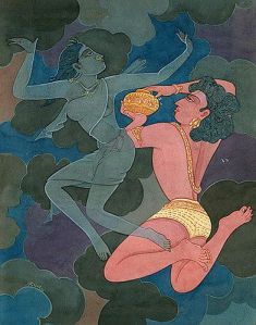 [9-10] Por cada esfuerzo uno debería reunir juntos dos tolas[10] de sambal[11]. Uno debería recitar sobre el sambal los tres mantras bijas Klim Hrim Klim[12] 108 veces. Muy cuidadosamente uno debería recoger 80 tolas de leche de una vaca negra, y debería recitar el mantra 108 veces.