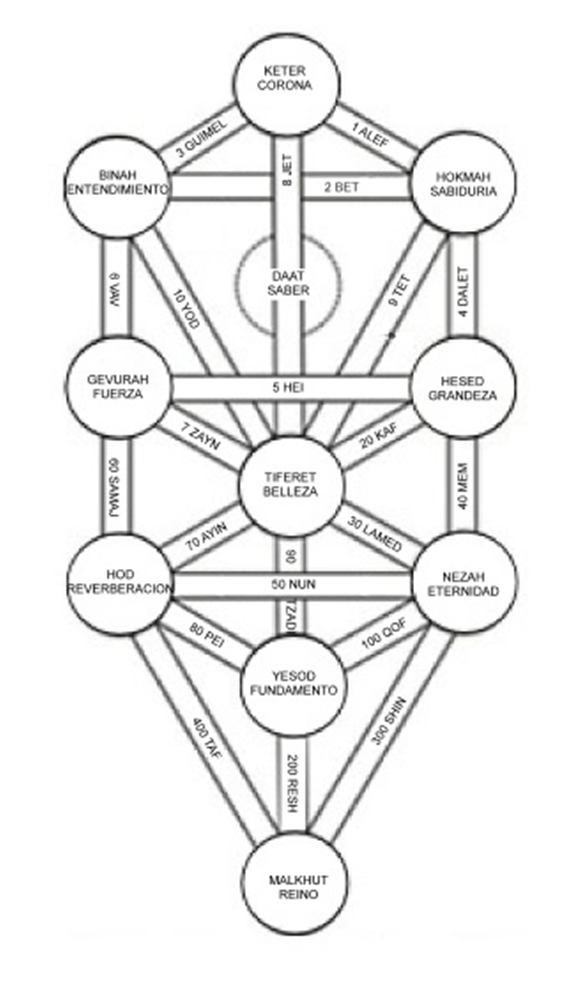 Los 10 sefirot y las 22 vías que los unen conforman los 32 sederos místicos, y a cada uno de estos senderos corresponde una letra del alfabeto hebreo. En este alfabeto, cada letra representa tanto un fonema como un valor numérico.