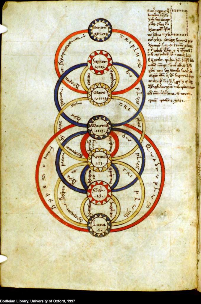 “Igual que en la esfera existen siete planetas o estrellas móviles, a través de las cuales se llevan a cabo los decretos de la esfera y de los existentes, así se encuentran en el cuerpo siete facultades, en las cuales se basa el bienestar del cuerpo, que son las facultades de atracción, retención, maduración, repulsión, nutrición, formación y crecimiento. Los planetas tienen alma y cuerpo, obran efectos materiales sobre los cuerpos, y efectos espirituales sobre el alma. Hemos enumerado las siete facultades materiales del cuerpo, pero hay también siete facultades espirituales, que son los cinco sentidos: vista, oído, gusto, olfato, tacto, y las facultades del discurso y el intelecto. A estas cinco facultades perceptivas corresponden los cinco planetas, a la facultad discursiva corresponde la Luna, y a la intelectual, el Sol.”
